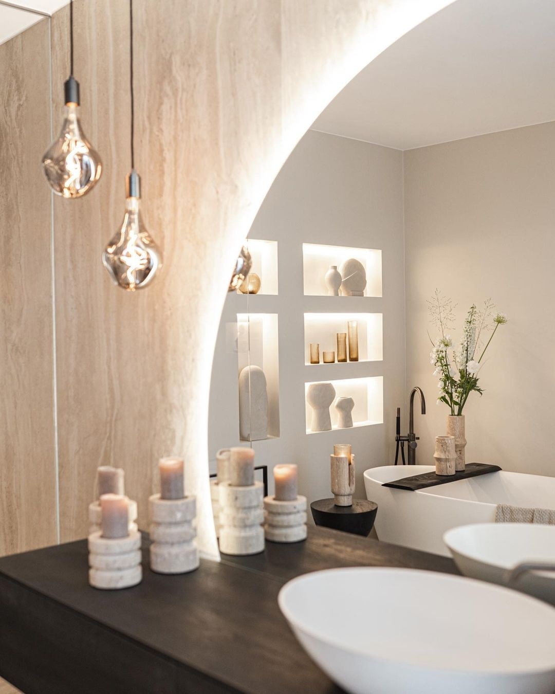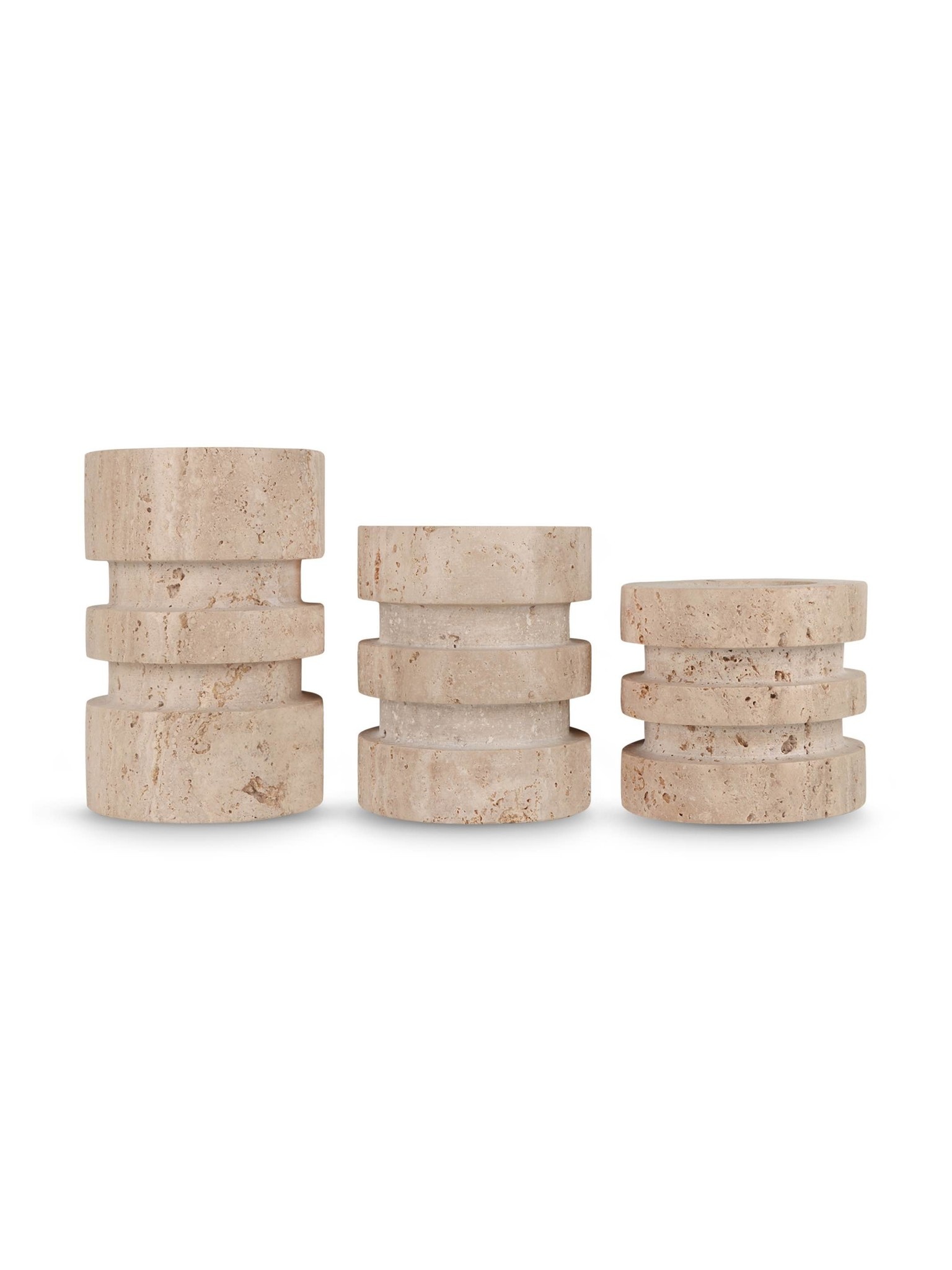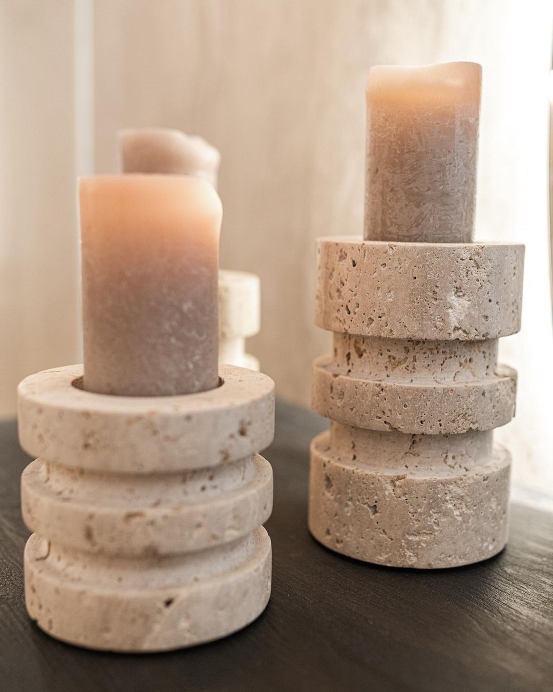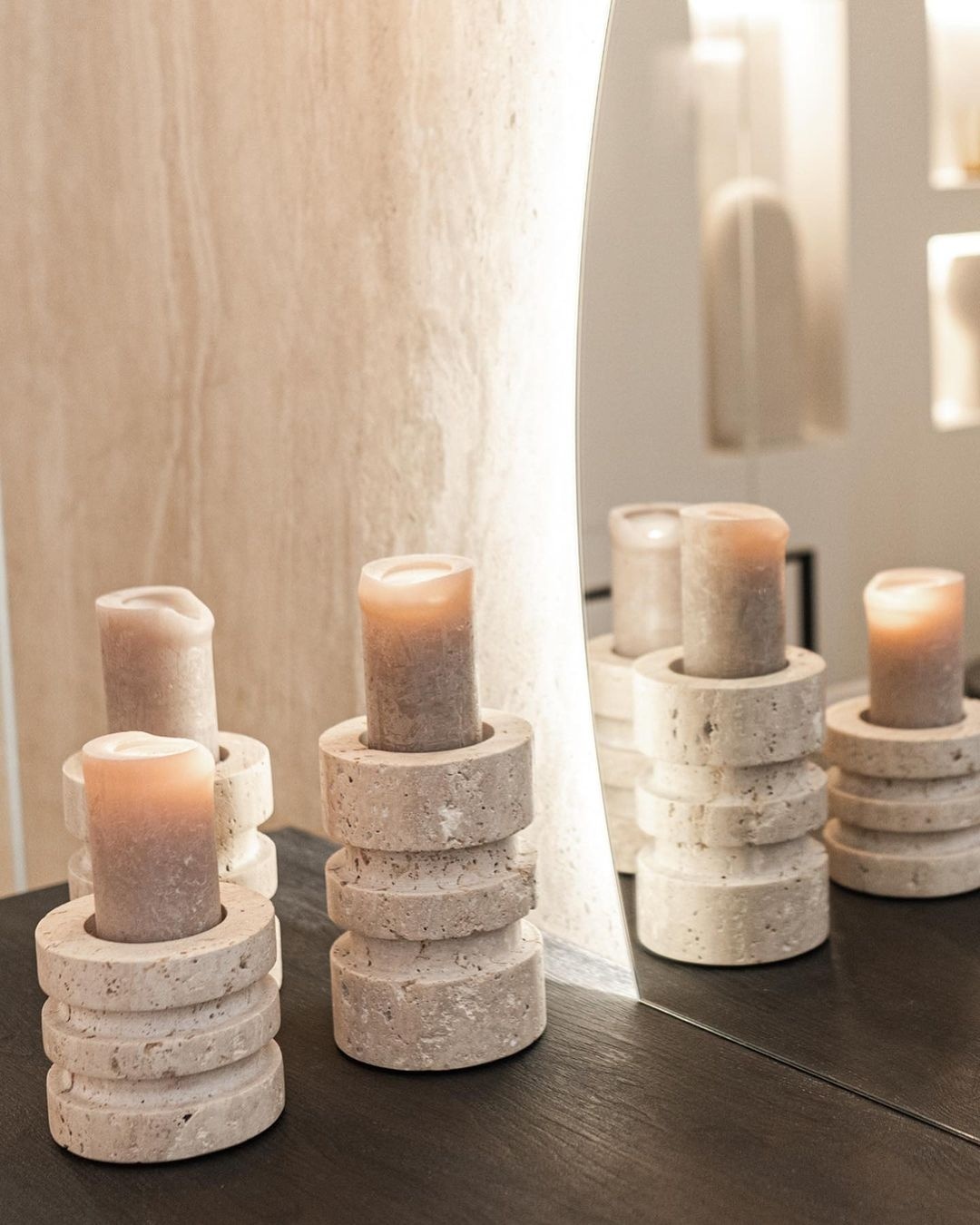 The candlestick is made of travertine and derives the luxurious look from the traditional method of production. Each copy is hand-crafted, so small imperfections are part of the product.
