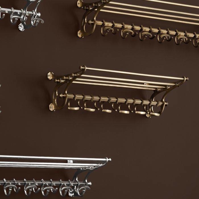 The brass finished Hudson Coatrack is reminiscent of the luggage racks in old steam trains. This nostalgic wall mounted coat rack features 13 hooks for hanging overcoats and jackets and a top shelf for gloves, hats and the like.