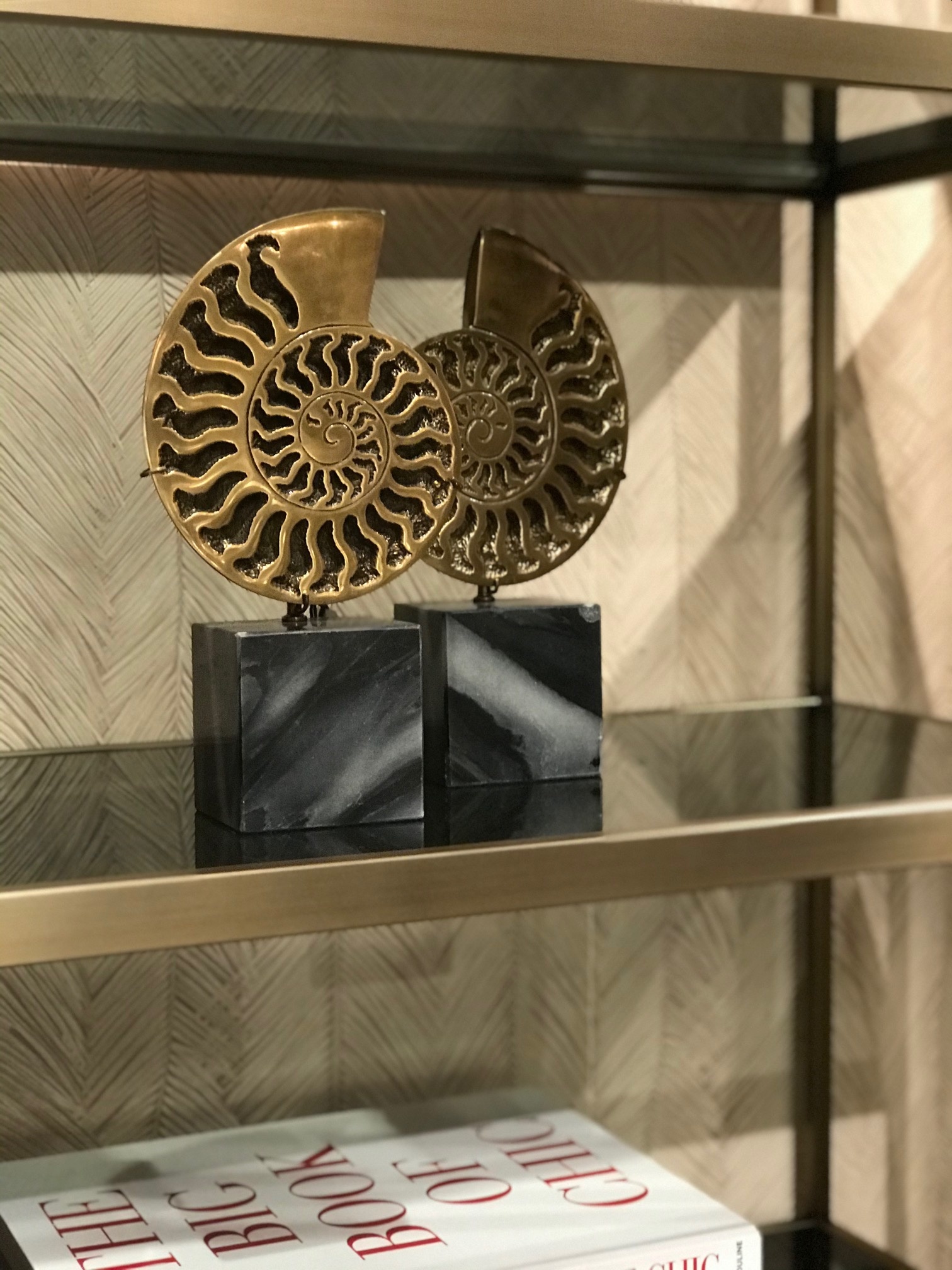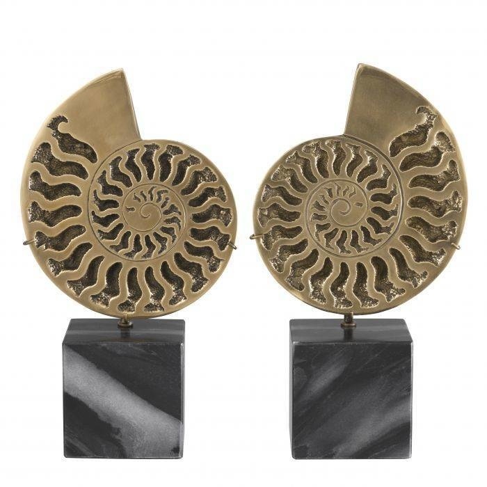 This gorgeous set of 2 Ammonite Objects with vintage brass finish, representing Perisphinctes ammonite fossils. Ammonites were prehistoric marine animals with a coiled shell. They became extinct at the end of the Cretaceous period, about 66 million years ago, at roughly the same time as the dinosaurs disappeared. The objects are each mounted on a grey marble base.