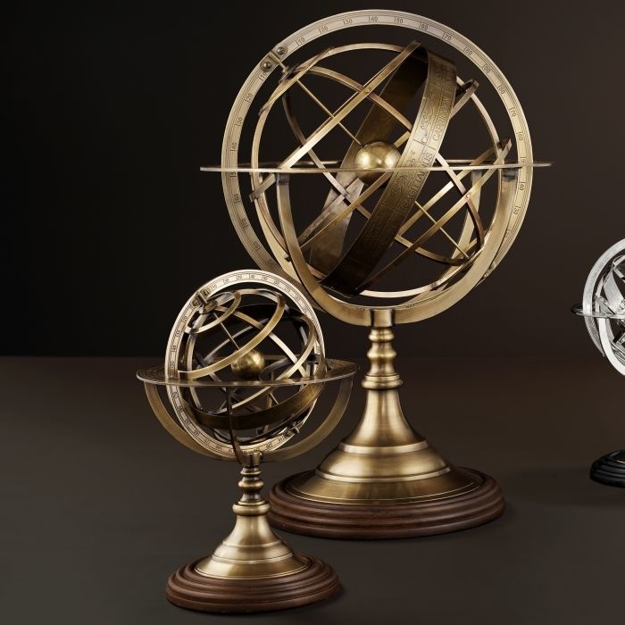 Bring the whole world within reach with this beautiful openwork Globe. With its detailed etched zodiac, axis and pedestal with brown plinth, this large globe with antique brass finish lends character to any shelf, desk, or tabletop.