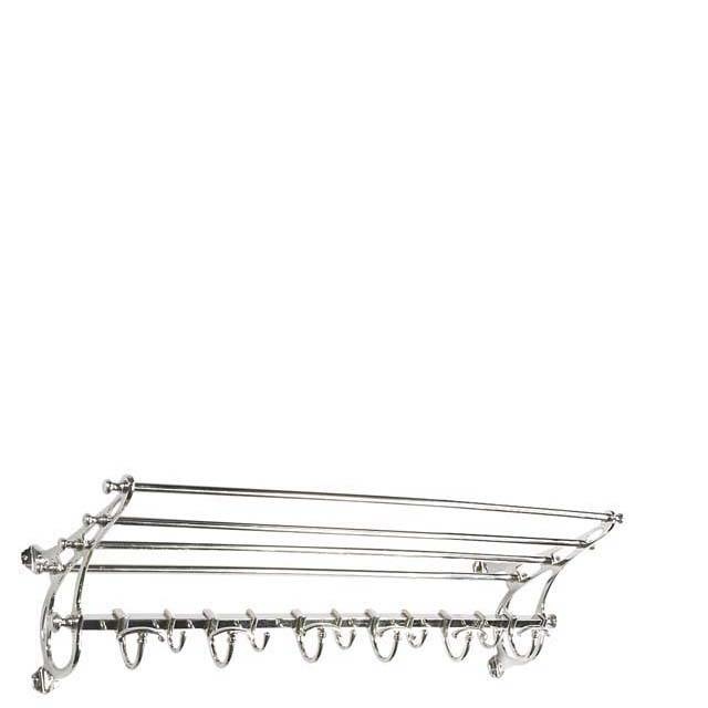 The nickel finished Hudson S Coatrack is reminiscent of the luggage racks in old steam trains. This nostalgic wall mounted coat rack features 13 hooks for hanging overcoats and jackets and a top shelf for gloves, hats and the like.
