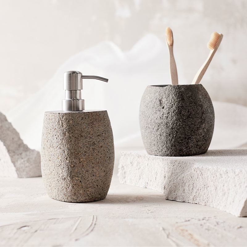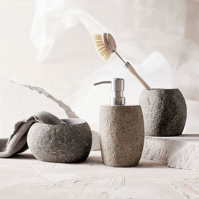 The Valley series soap dispenser from the MUUBS brand is a beautiful dispenser made of natural river stone from Indonesia. The series in natural stone gives the home a raw look and adds soul and edge to the room. The soap dispenser can be used both in the bathroom and in the kitchen.
