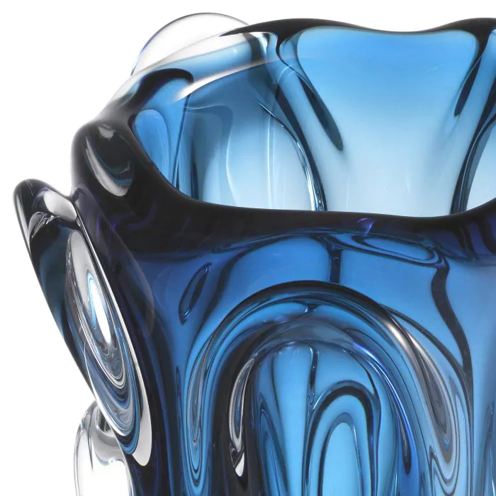 Handblown from blue glass and embellished with arc-shaped decorations, Vase Aila is a perfect fit for a coffee table, console or empty shelf in your home. With its interesting silhouette and vibrant colour, this artistic vase will instantly elevate the space.