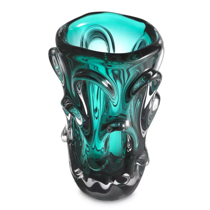 Handblown from turquoise glass and embellished with arc-shaped decorations, Vase Aila is a perfect fit for a coffee table, console or empty shelf in your home. With its interesting silhouette and vibrant colour, this artistic vase will instantly elevate the space.